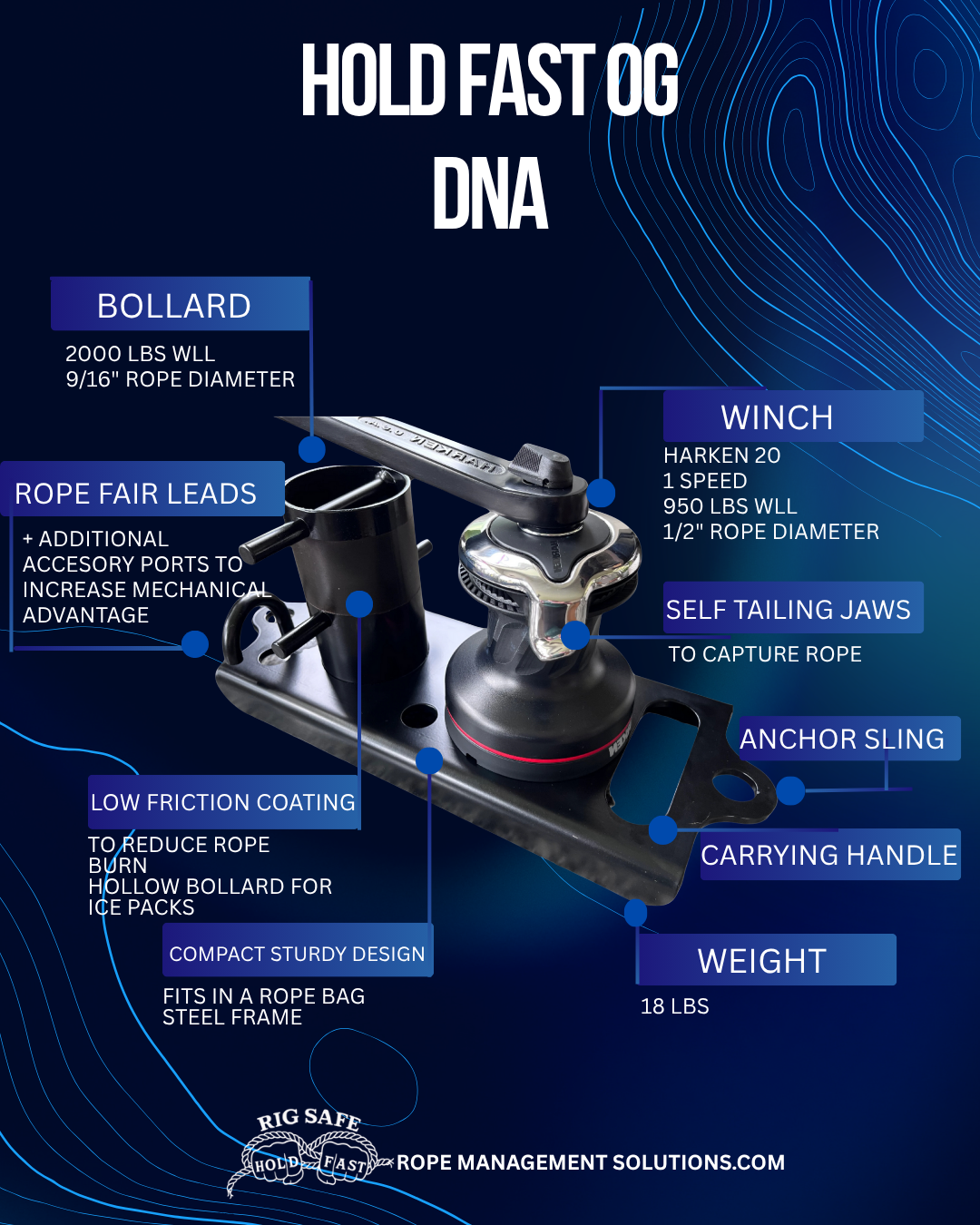 Designed to be light and portable, the HOLD FAST rigging system combines the mechanical advantage of a self-tailing Harken winch with the strength and stability of a fixed bollard for simultaneous lifting and lowering capabilities in one compact package. Patent Pending.
